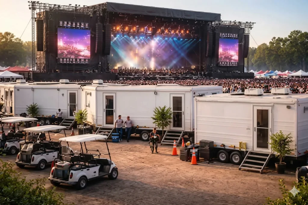Every event site has practical needs. Entry points need structure. Restricted areas need control. Guests need clean facilities. Staff need transportation. Production teams need organized layouts.