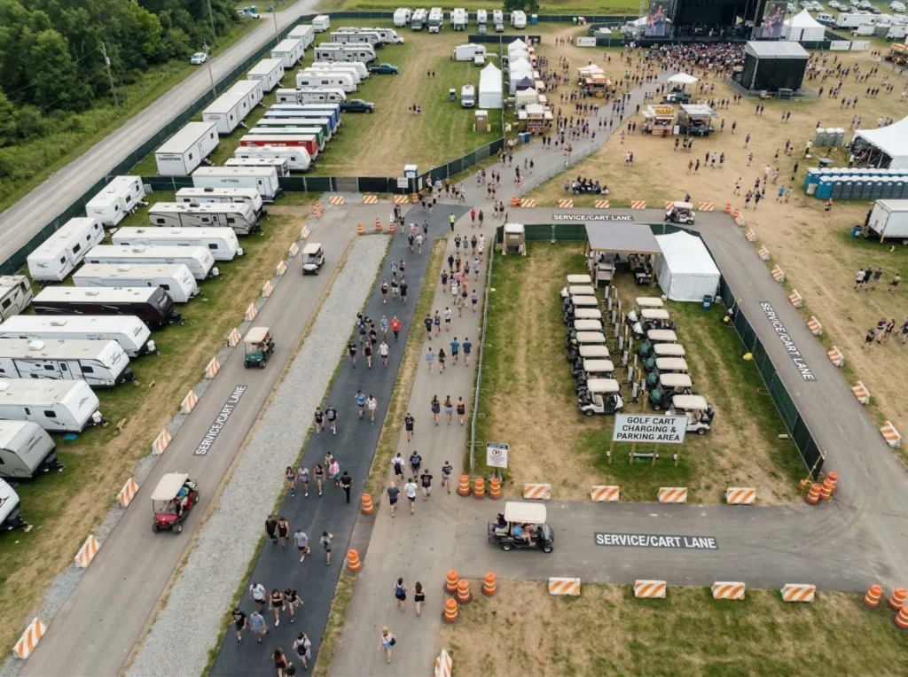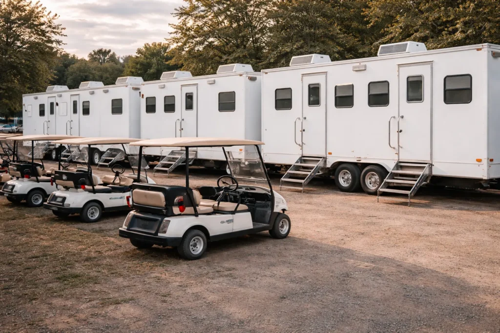 Golf cart services reduce travel time across large footprints. Trailer rentals and services provide fixed spaces for coordination, ticketing and sales, storage, and private use. Together, they help keep schedules on track and teams focused.