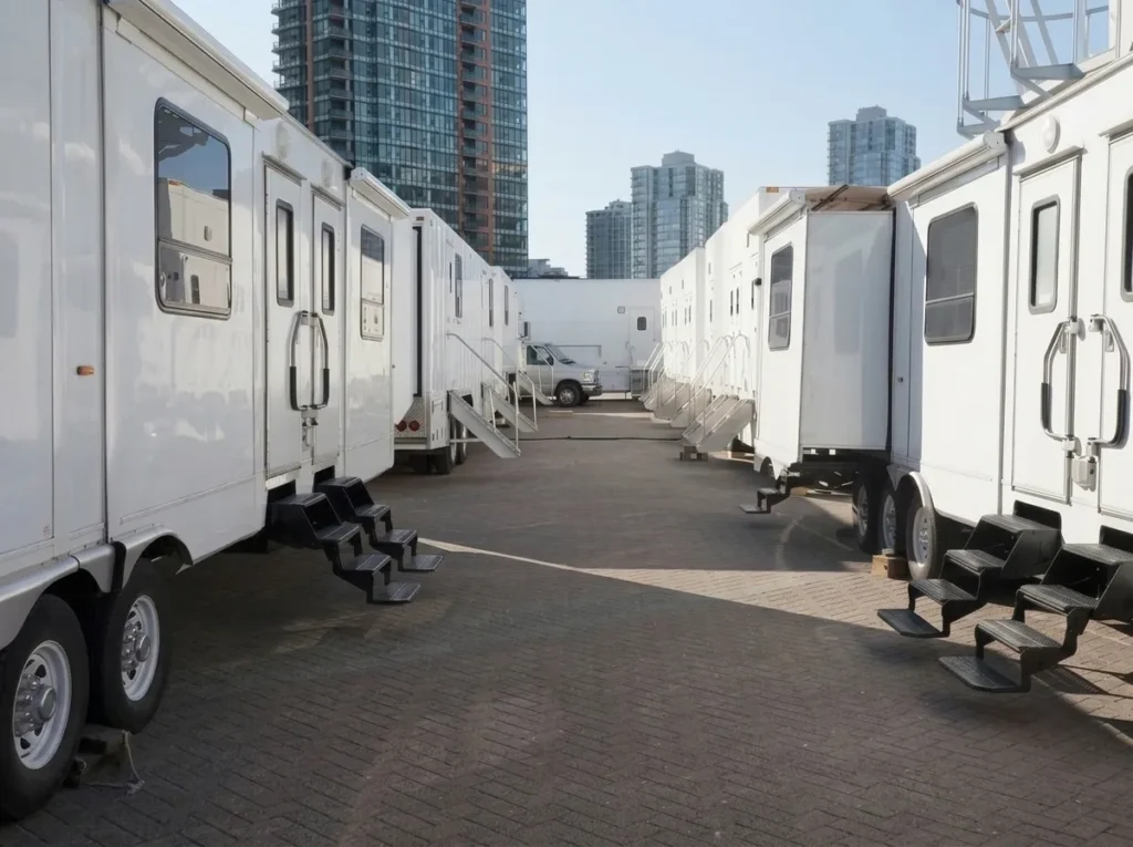 Office and production trailers support operations, ticketing and sales, planning, and technical coordination. Artist and VIP trailers provide private, comfortable spaces for talent and high-level guests. Production trucks and support trailers help manage equipment and logistics.